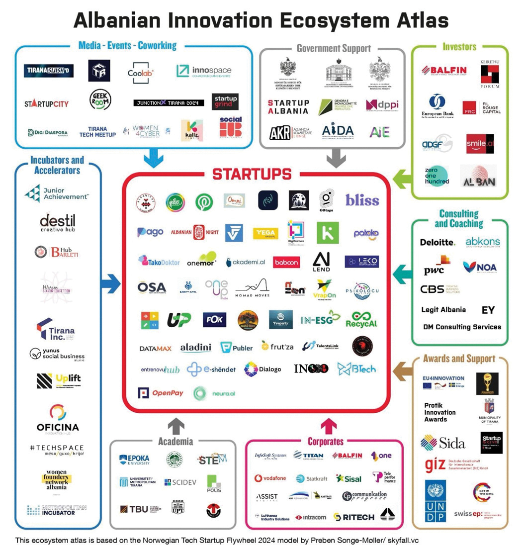 Harta “Albanian Innovation Ecosystem Atlas”, e bazuar në modelin norvegjez të Tech Startup Flywheel 2024, përpiqet ta vizualizojë këtë ndërthurje përmes një qasjeje që tregon se si bashkëveprojnë hallkat e ndryshme të sistemit.