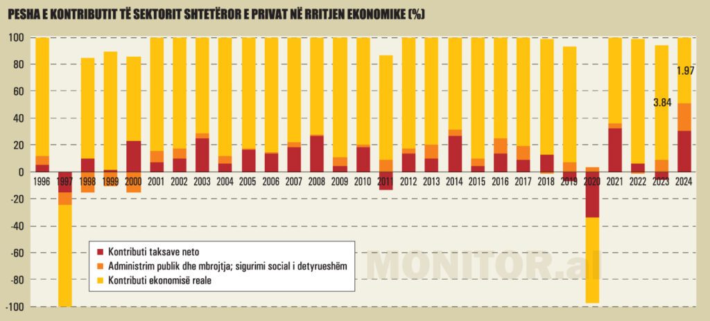 Për herë të parë në historinë e post-tranzicionit, shteti ka qenë kontribuuesi më i madh i ekonomisë në vitin 2024, duke sjellë më shumë se gjysmën e rritjes. Ironikisht, fakti që shteti po mban mbi shpinë më shumë se gjysmën e rritjes ekonomike na rikthen në kujtimet e ekonomisë socialiste, ku rritja mbështetej te shteti dhe jo te prodhimi real.
